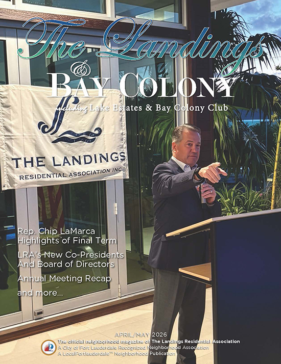 We’re delighted to invite you to read about it in our official neighborhood newsmagazine, THE LANDINGS & BAY COLONLY. It’s published bimonthly in print and online with essential civic information, neighborhood issues and city updates. The print version is MAILED to EVERY home, residence and business in the Landings, as well as to our Bay Colony, Bay Colony Club and Lake Estates neighbors. The online version is an exact duplicate of the print version and is always available here on our website. Click on the cover to the right to view it now!